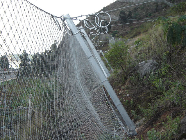 材質(zhì):鋼絲繩網(wǎng)、支撐繩和減壓環(huán)構(gòu)造:由鋼絲繩網(wǎng)或環(huán)形網(wǎng)(需攔截小塊落石時(shí)附加一層鐵絲格柵)、固定系統(tǒng)(錨桿、攔錨繩、基座和支撐繩)、減壓環(huán)和鋼柱四個(gè)主要部分構(gòu)成。